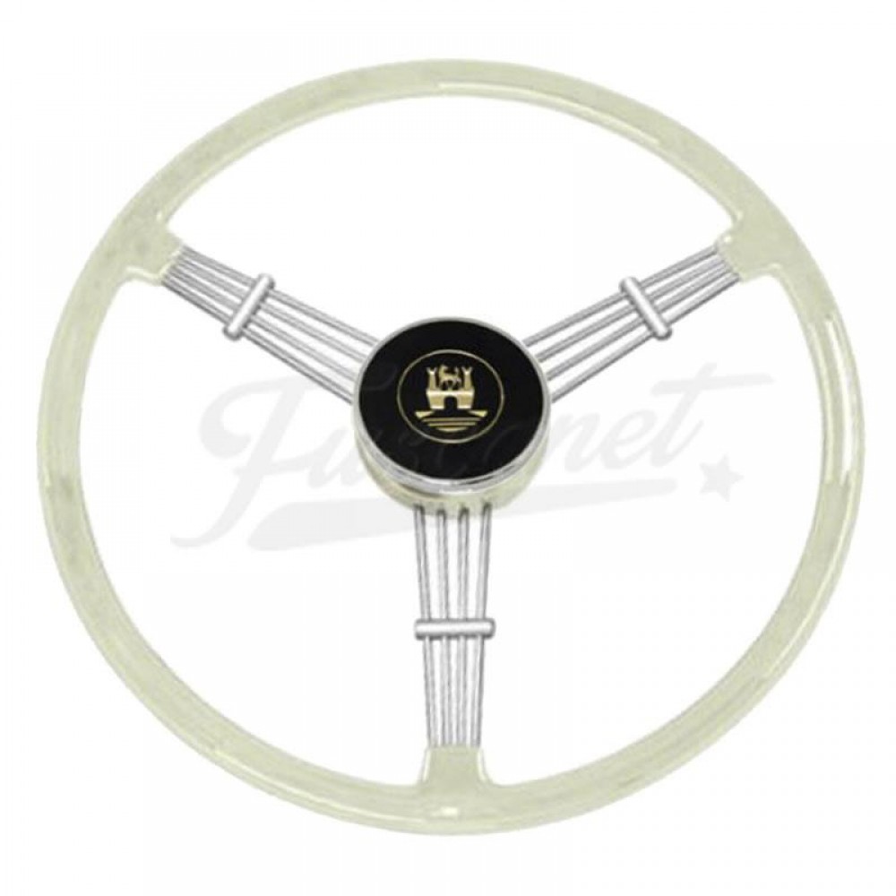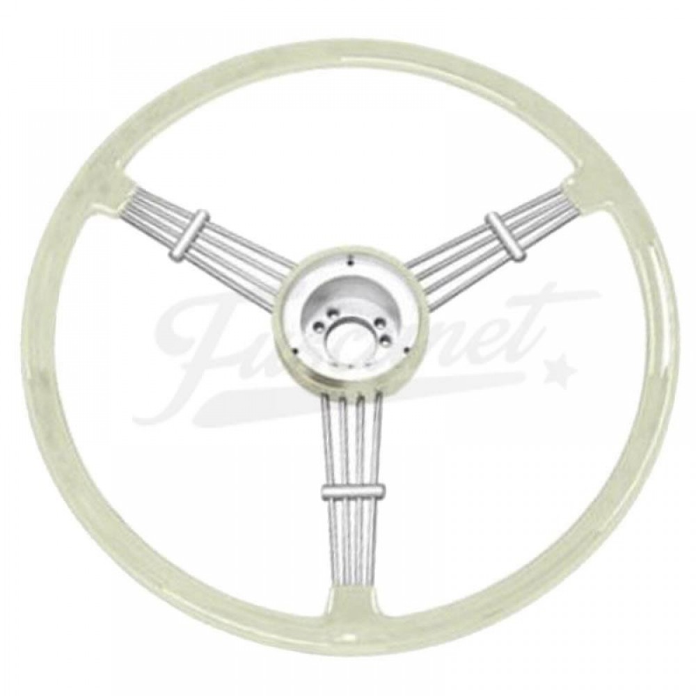Volante vintage de 3 raios, estilo Banjo, de 390mm de diâmetro. Possui apoios para os dedos na parte inferior e um visual retrô. Acompanha botão de buzina. É necessário comprar um kit de adaptação para completar a instalação.